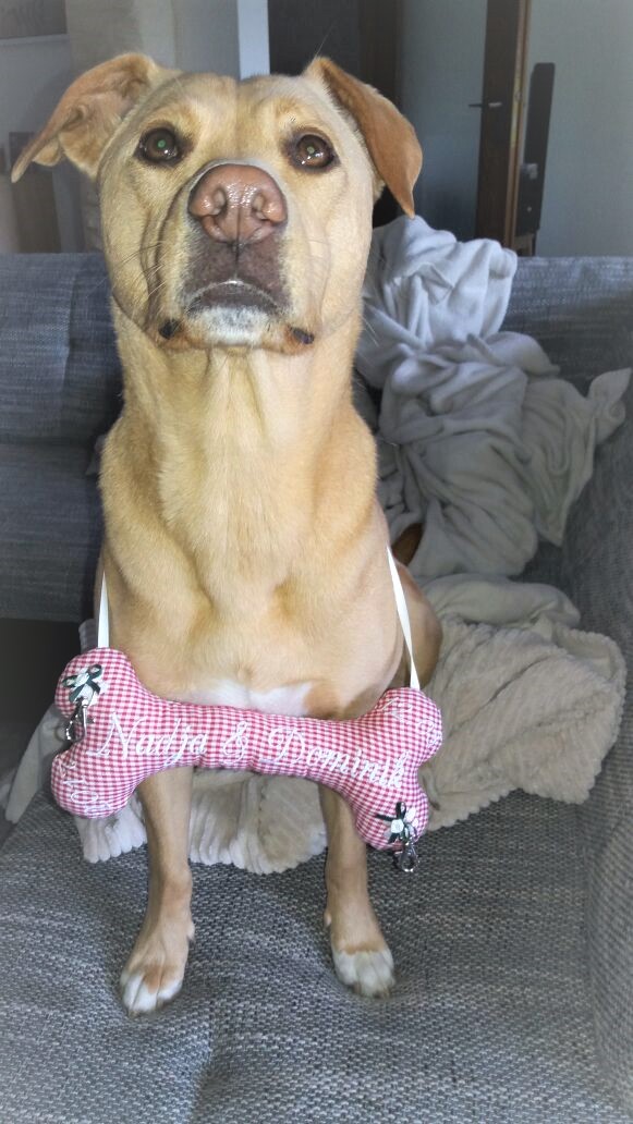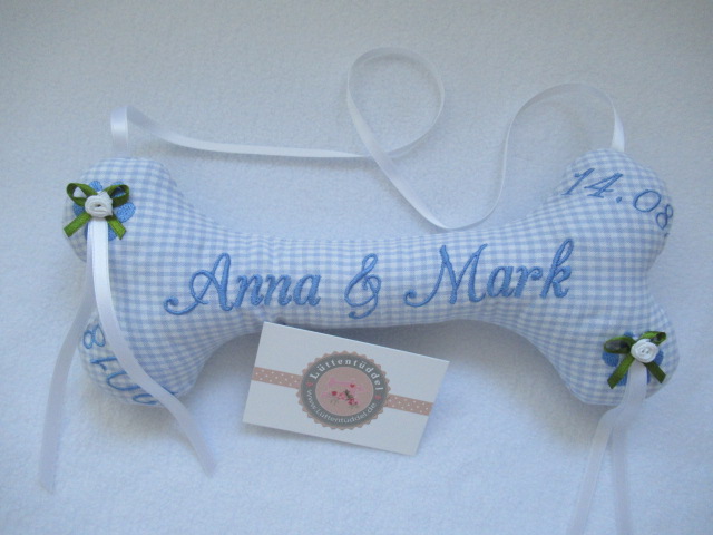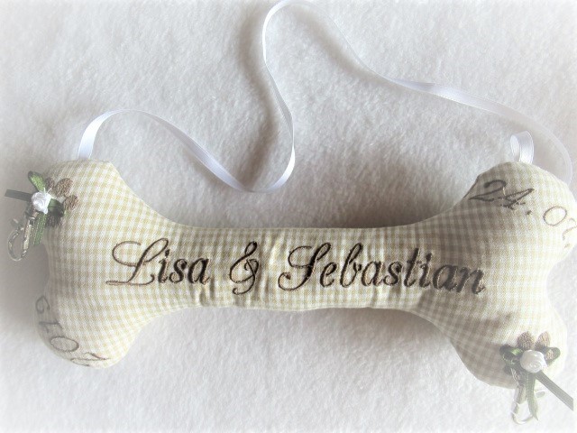 Gern kann auch ein Satinband angenäht werden, damit der Hund den Knochen zum Altar bringen kann :-)