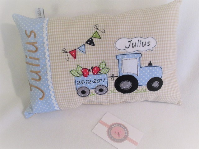 ★ 35x23 cm Kissen Geburt Kita Einschulung Taufe Traktor Trecker Name ★ von Lüttentüddel