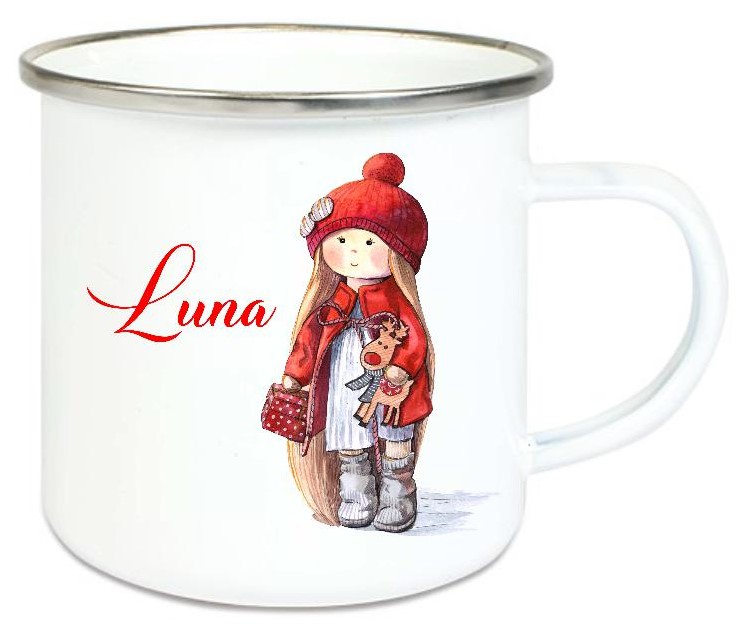 ♥ Tasse Emailletasse Winter Mädchen Doll tolle Farben, Wunschname, Einschulung KITA Dankeschön, Abschied, Jubiläum, Geschenk, Becher von Lüttentüddel