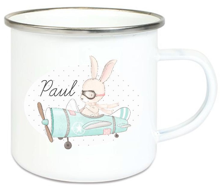 ♥ zauberhafte Tasse Emailletasse Pilot Flugzeug Hase blau, Name, Wunschname, KITA Kindergarten, Einschulung, Dankeschön, Abschied, Jubiläum, Geschenk, Becher von Lüttentüddel