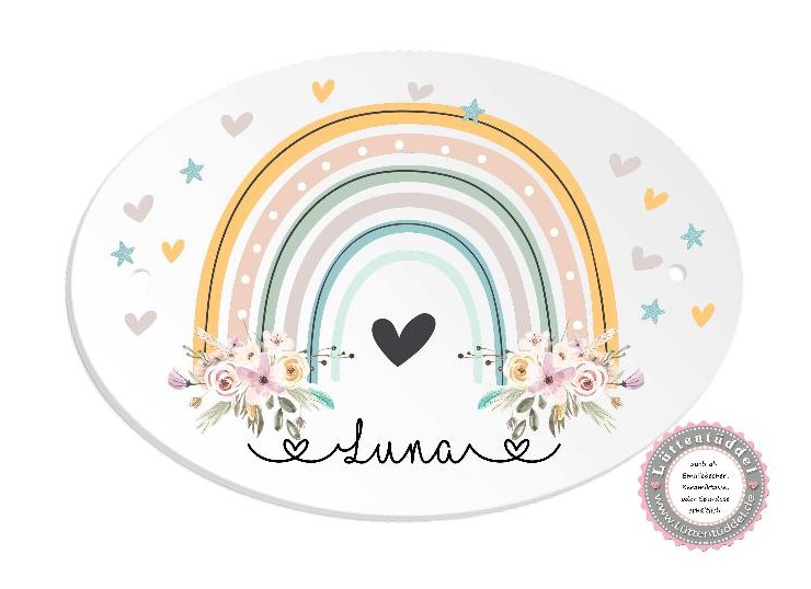 zauberhaftes ovales Türschild mit Regenbogen Blüten Herzen und Wunschname, Kinderzimmer- zur Einschulung, Geburtstag, Taufe, Lüttentüddel®