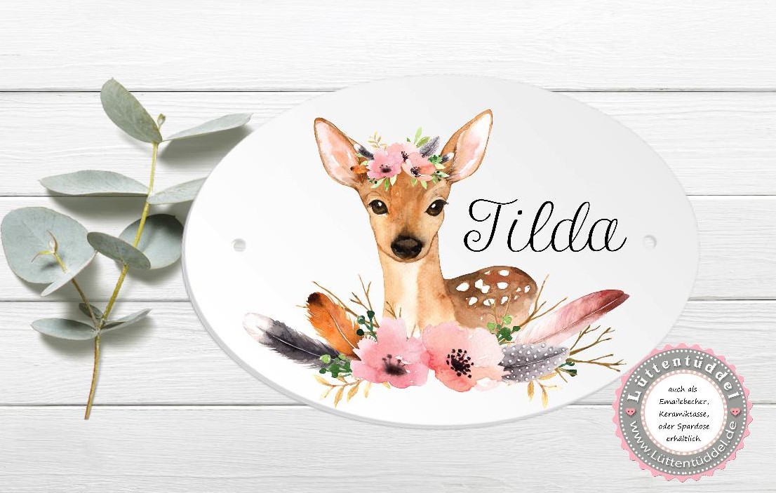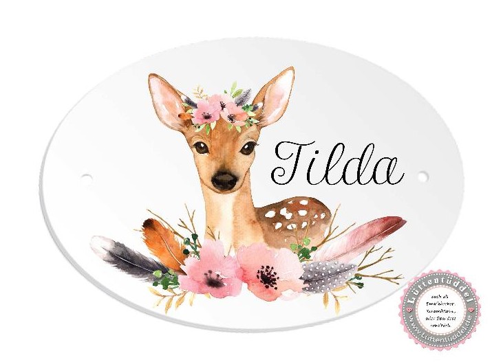 zauberhaftes ovales Türschild mit Reh und Wunschname, Kinderzimmer- zur Einschulung, Geburtstag, Taufe, Lüttentüddel®