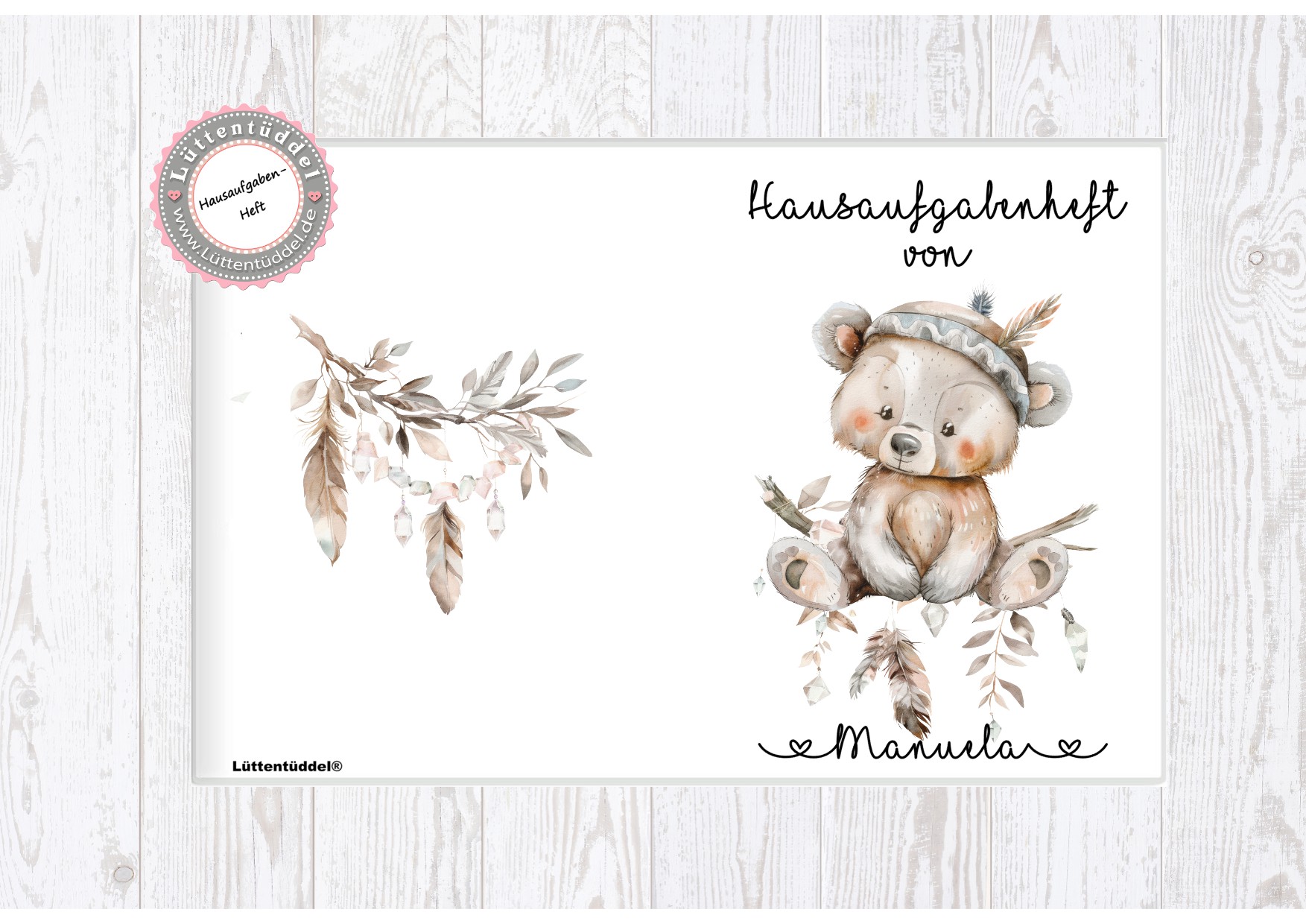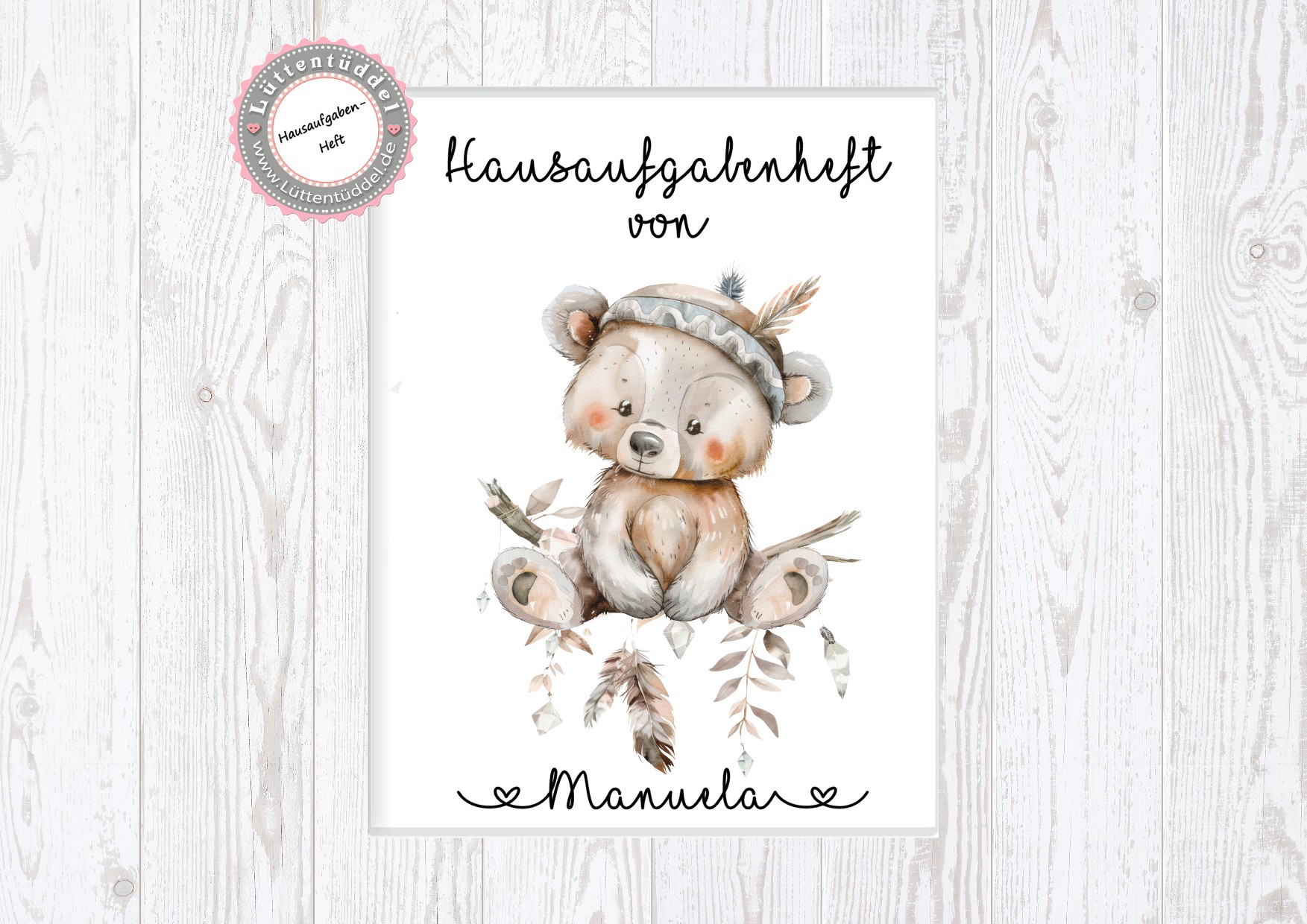 zuckersüßer Schulheft Umschlag Bär 2 Boho Style Hausaufgabenheft in seperater hochwertiger Hülle Einschulung Schulkind von Lüttentüddel®