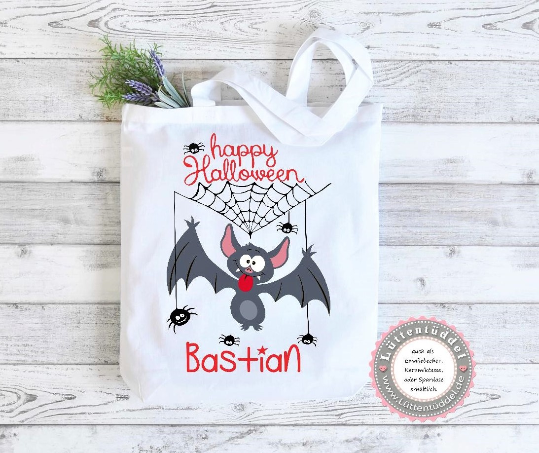 Tasche Halloween Beutel für Süßigkeiten freche Fledermaus Wunschname Süßes oder Saures, Kindergarten, Ausflug, von Lüttentüddel