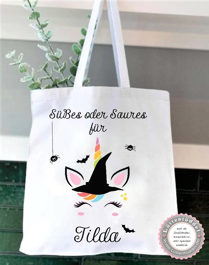 Tasche Halloween Beutel für Süßigkeiten zauberhaftes Einhorn, Süßes oder Saures, Wunschname, Kindergarten, Ausflug, Lüttentüddel®