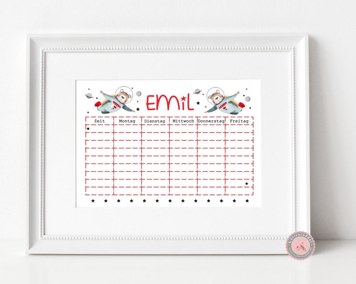 zuckersüßer Stundenplan, Astronaut Bär personalisiert mit Deinem Wunschnamen, Print A4 Einschulung Klassenwechsel  von Lüttentüddel® - Kopie